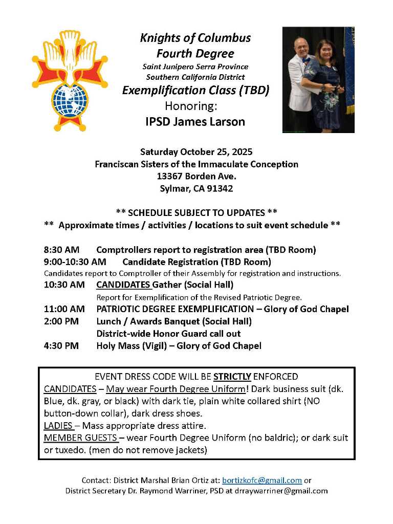 Fourth Degree Exemplification October 25 Christ Cathedral Assembly 3479 Posted on October 3, 2025 by webmasterOctober 3, 2025 Fourth Degree Exemplification October 25