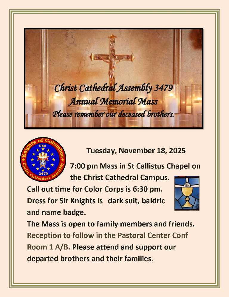 The Mass is open to family members and friends. Reception to follow in the Pastoral Center Conf Room 1 A/B. Please attend and support our departed brothers and their families.